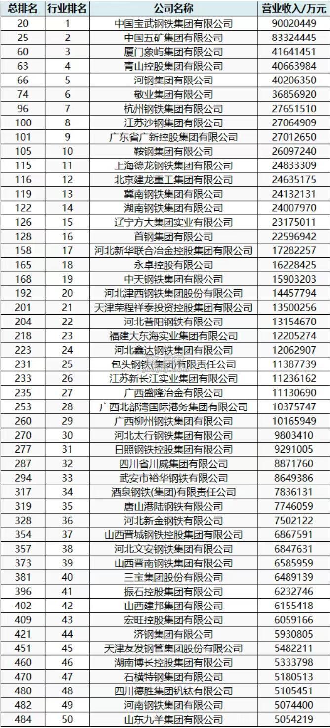 具体到钢铁行业,据不完全统计共有50家钢铁相关企业上榜“2025中国企业500,详情如下