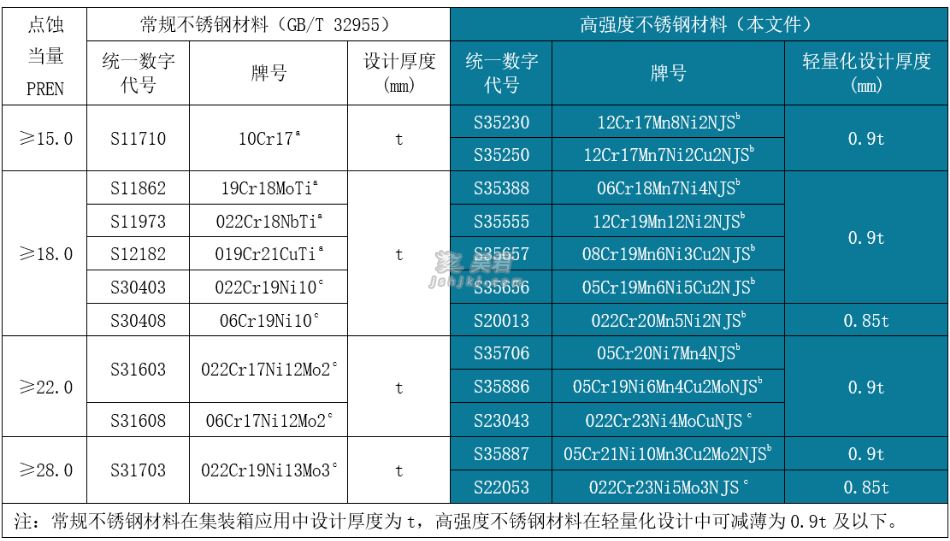表1:冷藏集装箱用高强度不锈钢轻量化推荐设计表(摘录于YB/T 6352-2025附录D)
